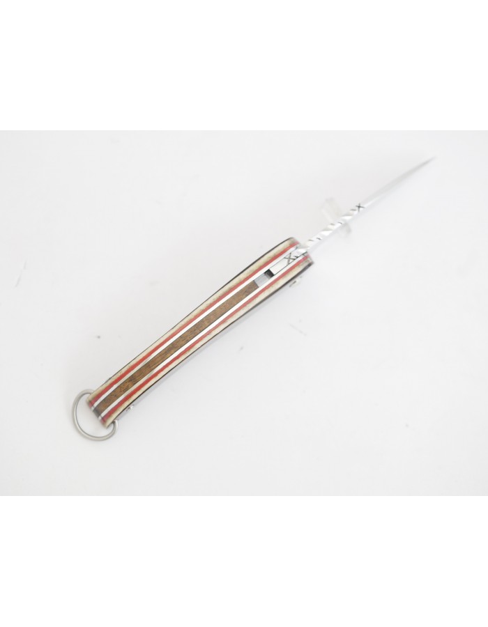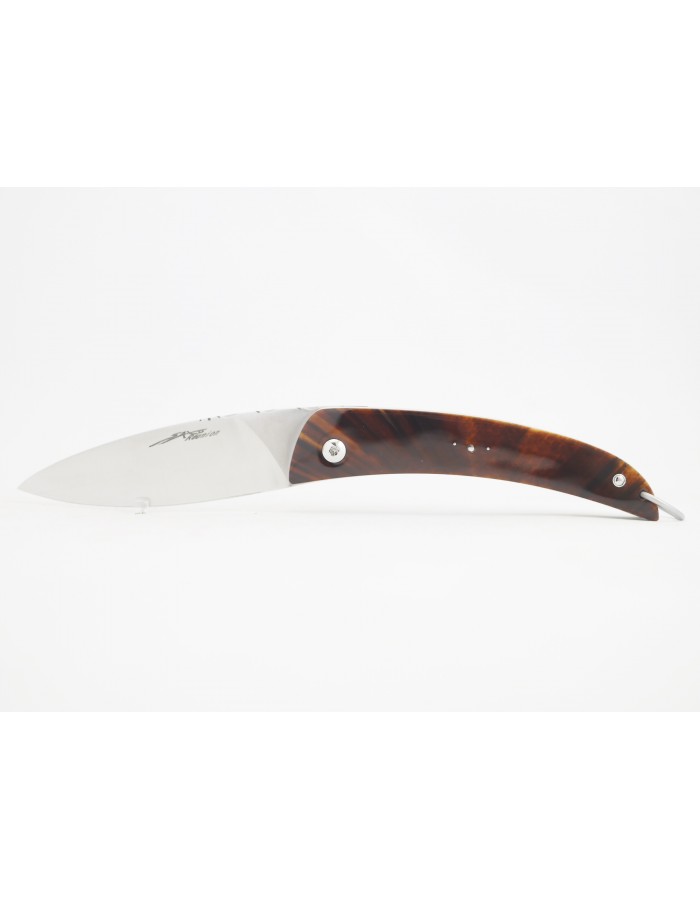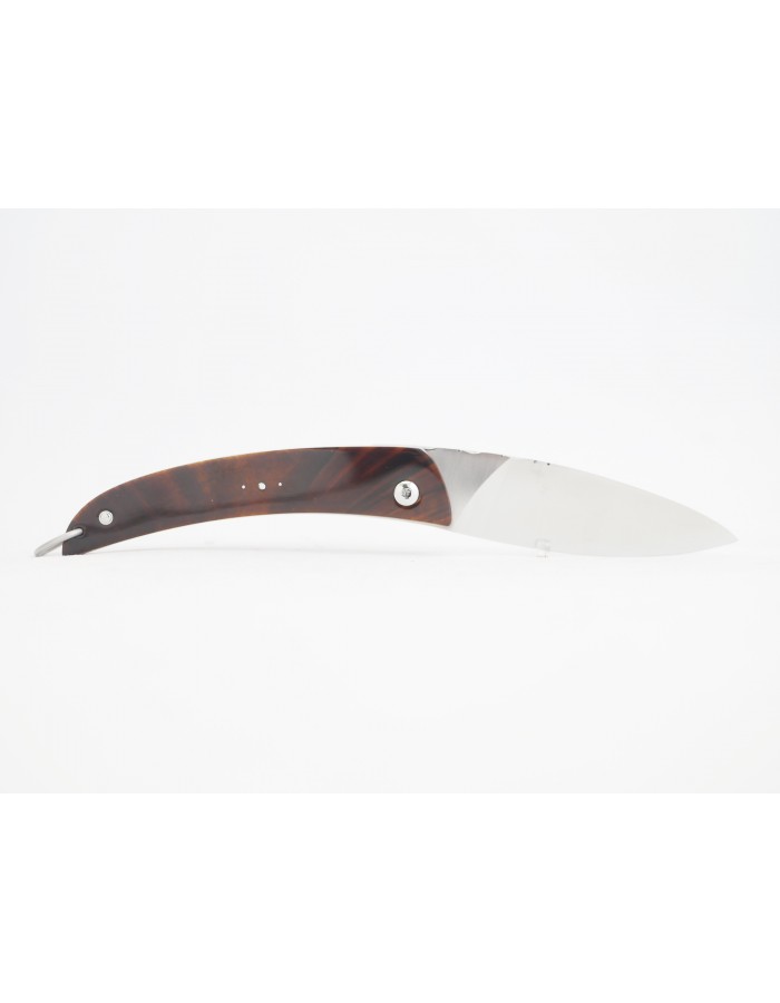 Ce couteau est un pliant à système "deux clous" ,muni d'un axe de butée en inox et d'un axe de lame en entretoise inox dont le serrage est réglable par clé Alen ( six pans creux) .